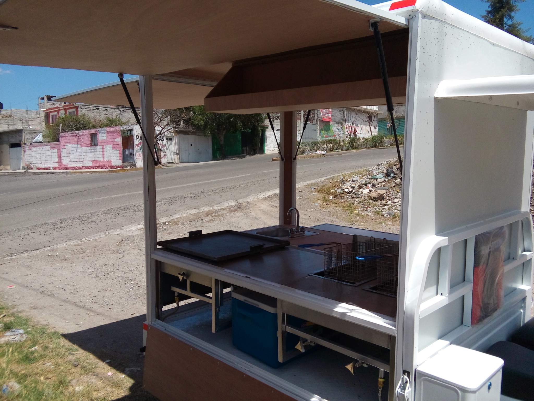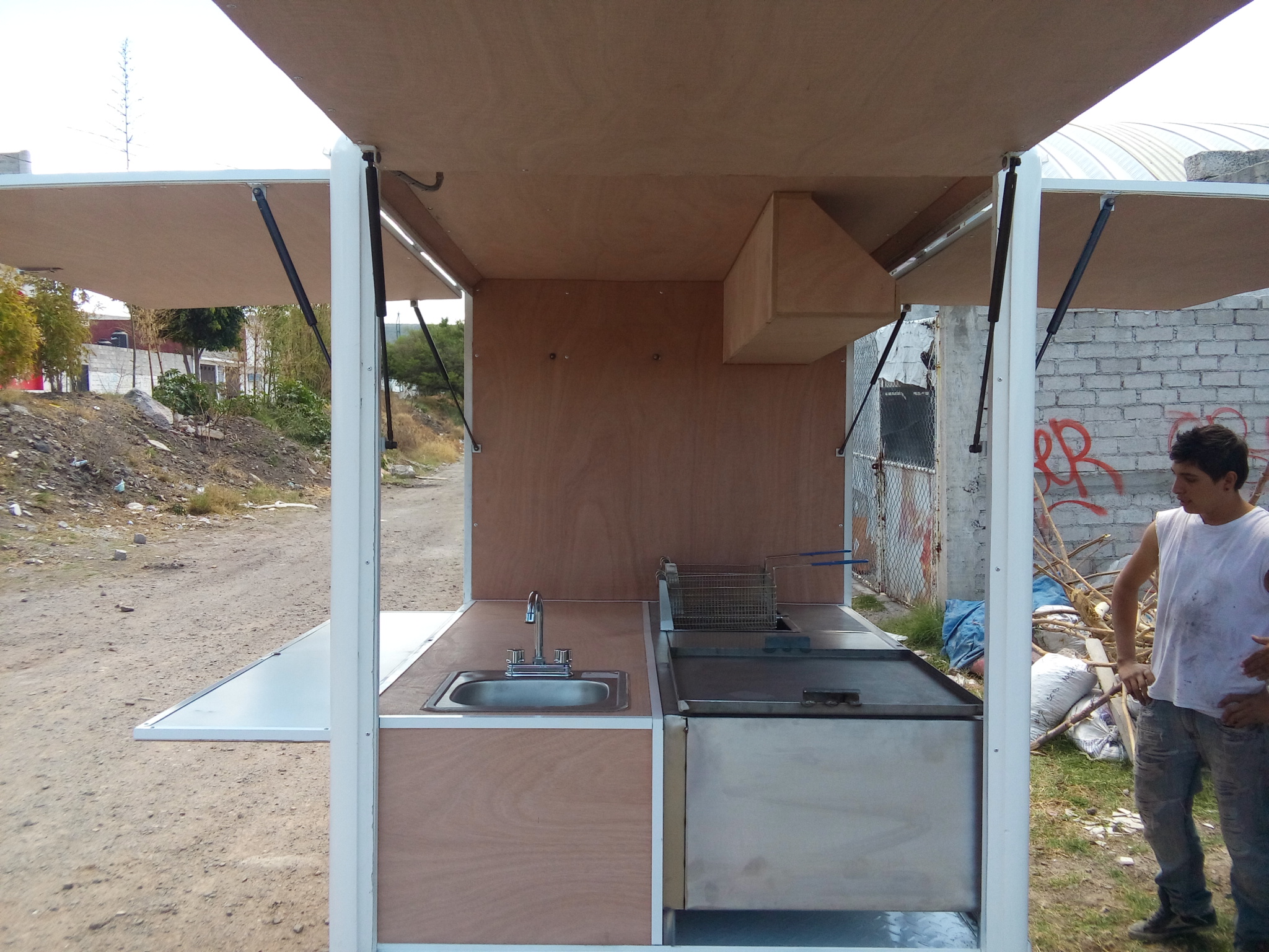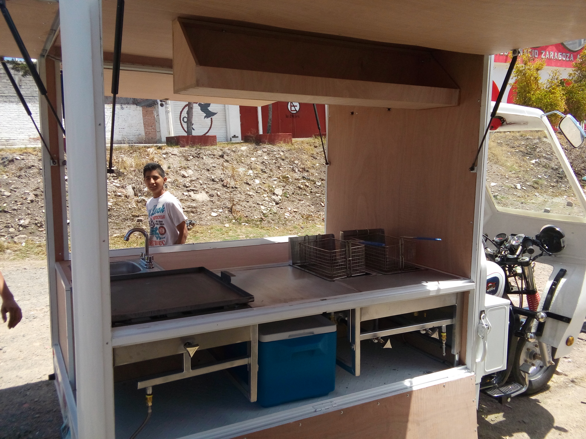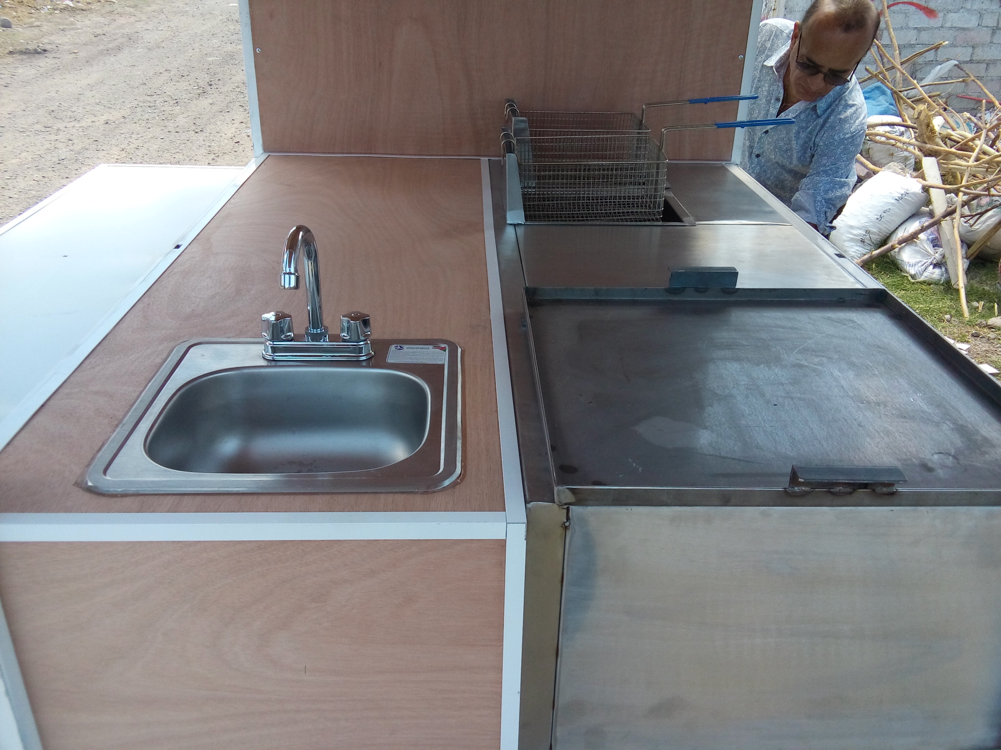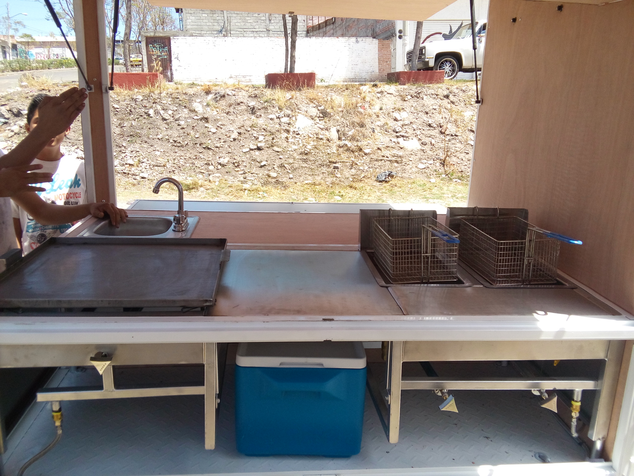 Equipado con instalación hidráulica, instalación de gas, mangueras, conexiones, mueble de acero inoxidable con freidoras y plancha, despensa superior, almacén inferior.