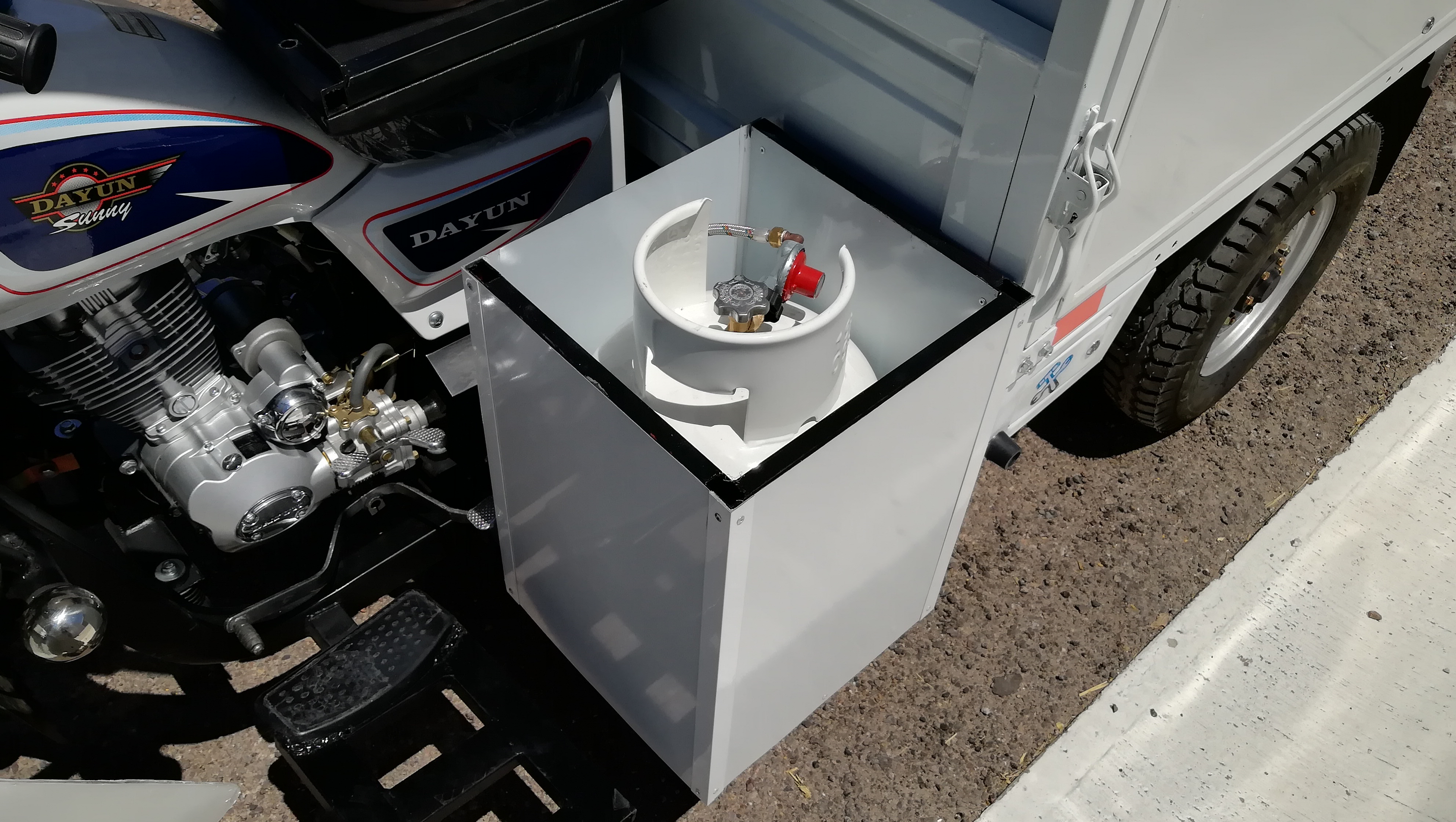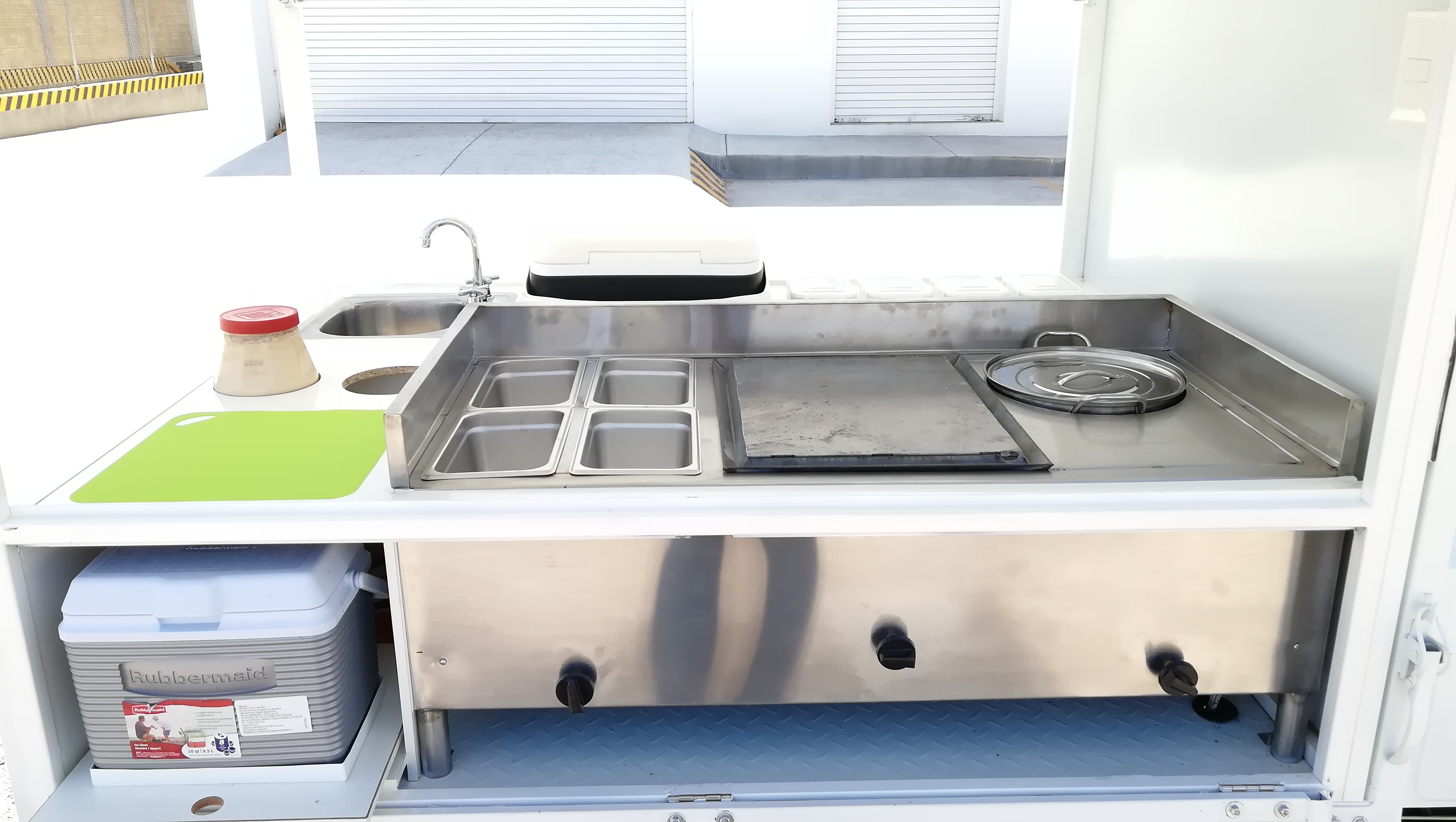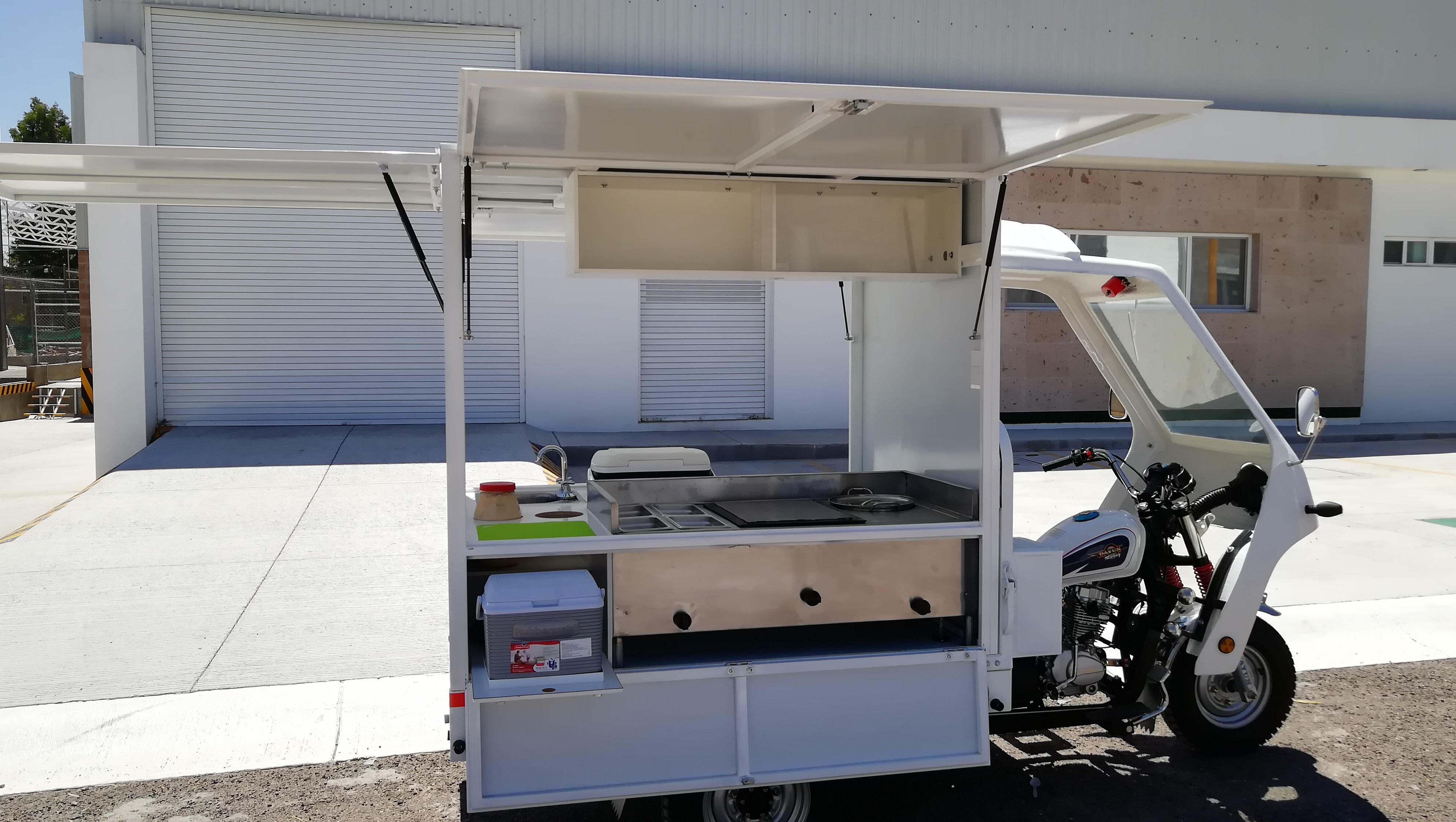 Food Trike equipado con carrocería de puertas laterales y trasera tipo ala de gaviota, despensa superior con puerta corrediza de acrílico, mueble de acero inoxidable con plancha, olla/vaporera, insertos de acero inoxidable para barra fría o baño maría, zona de trabajo con insertos para envases de mayonesa/mostaza comerciales, hielera inferior para perecederos, instalación hidráulica con tarja de acero inoxidable, hielera para bebidas, zona de autoservicio, iluminación LED, instalación de gas con tanque de 10 kg.