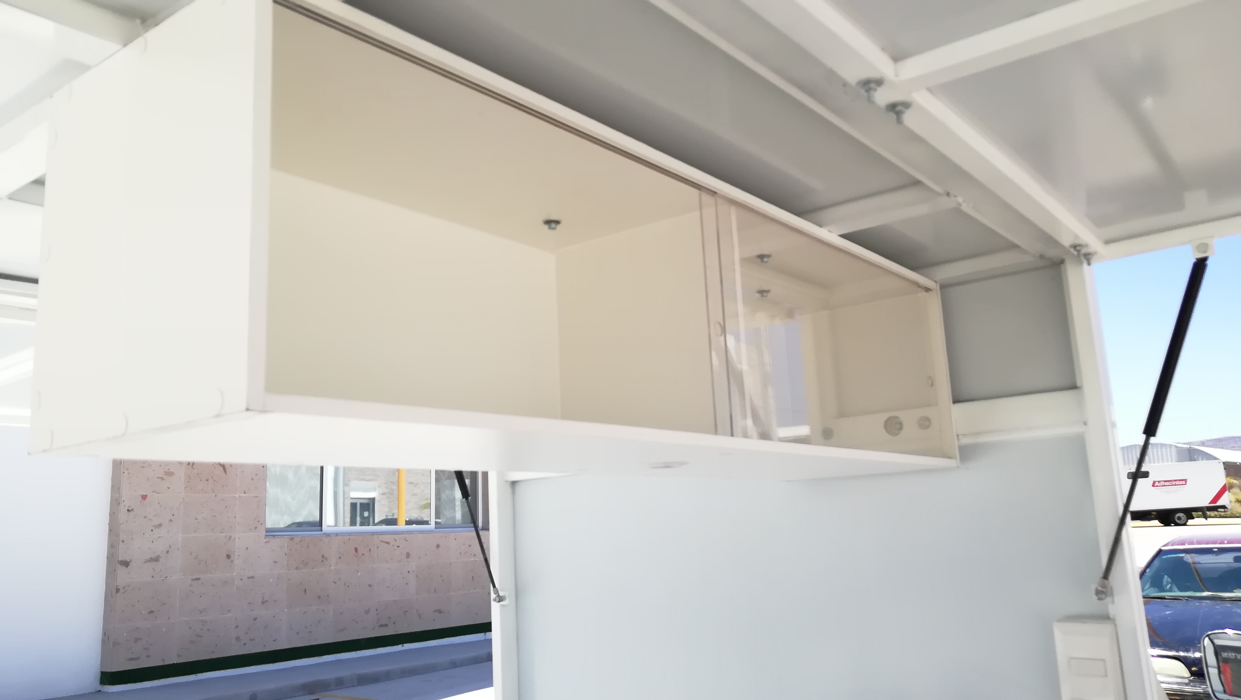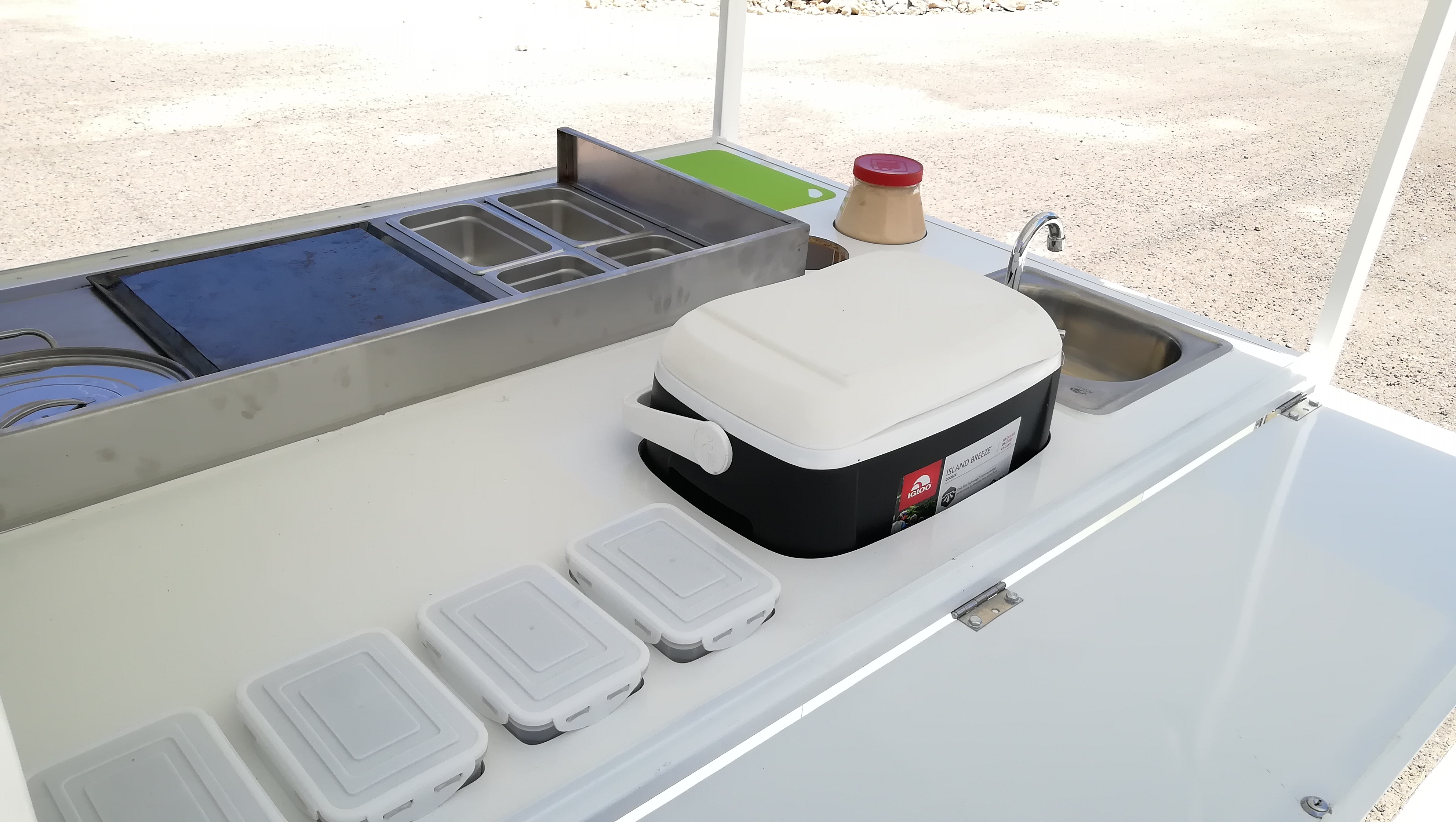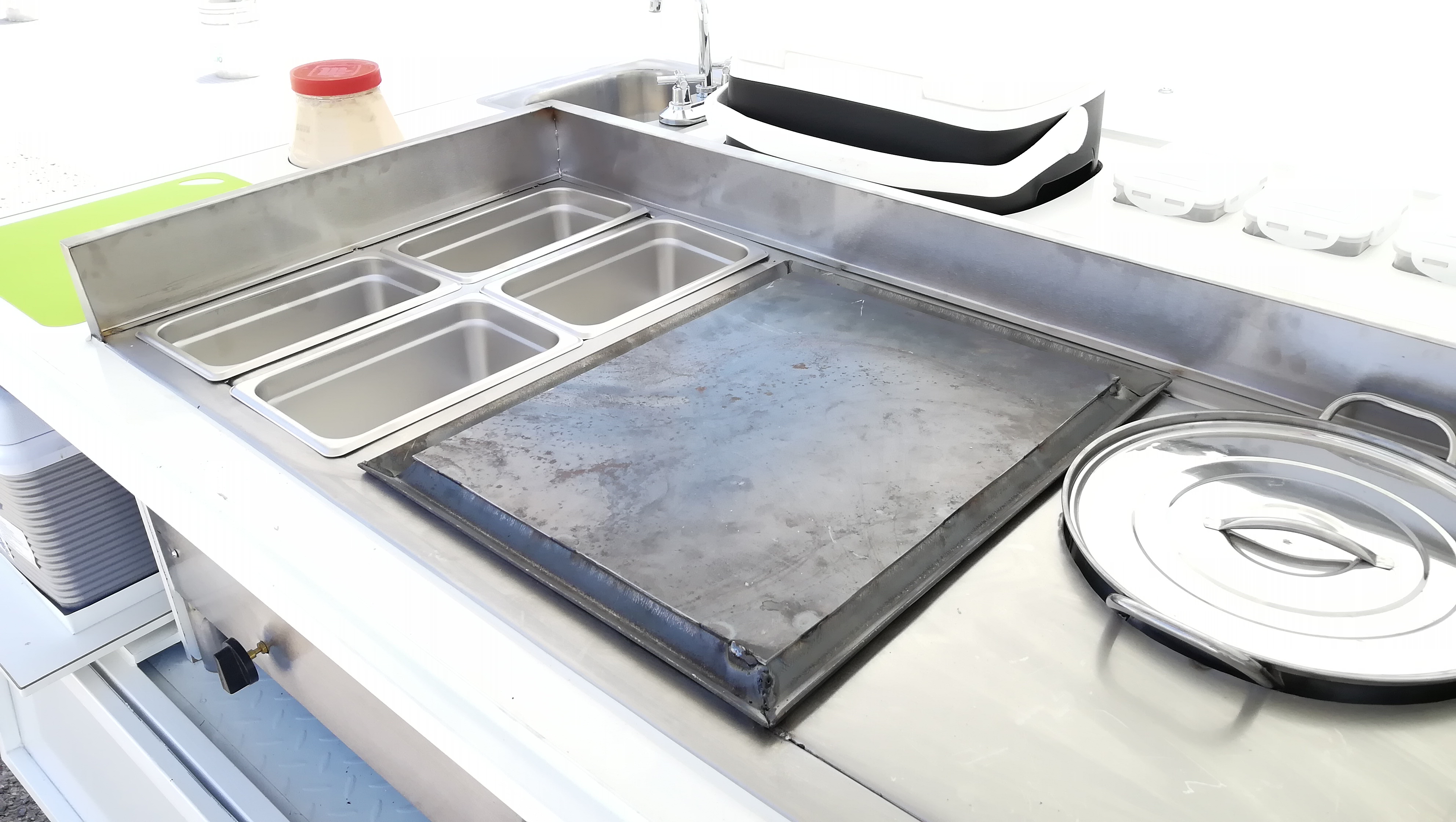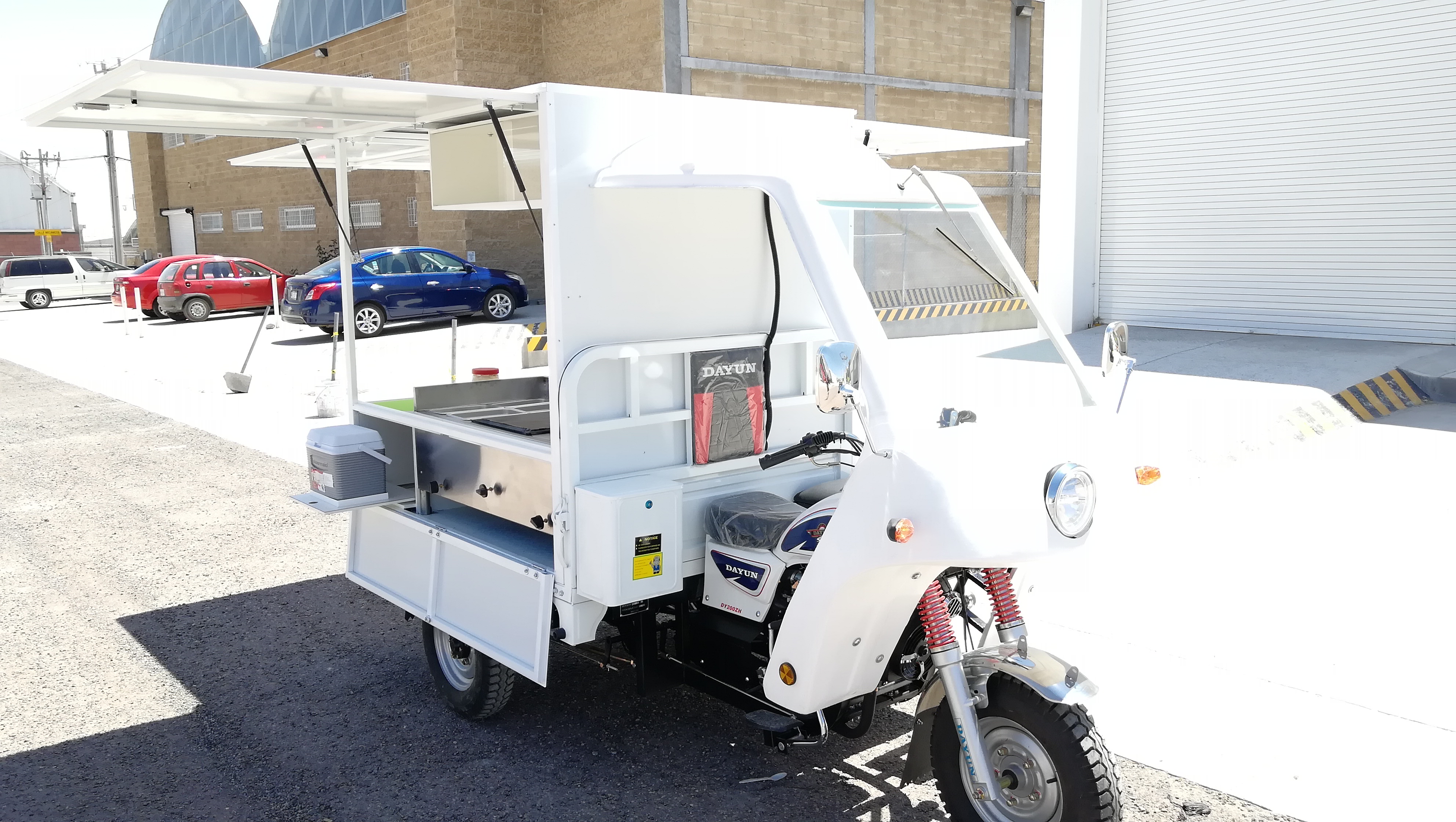 Food Trike equipado con carrocería de puertas laterales y trasera tipo ala de gaviota, despensa superior con puerta corrediza de acrílico, mueble de acero inoxidable con plancha, olla/vaporera, insertos de acero inoxidable para barra fría o baño maría, zona de trabajo con insertos para envases de mayonesa/mostaza comerciales, hielera inferior para perecederos, instalación hidráulica con tarja de acero inoxidable, hielera para bebidas, zona de autoservicio, iluminación LED, instalación de gas con tanque de 10 kg.