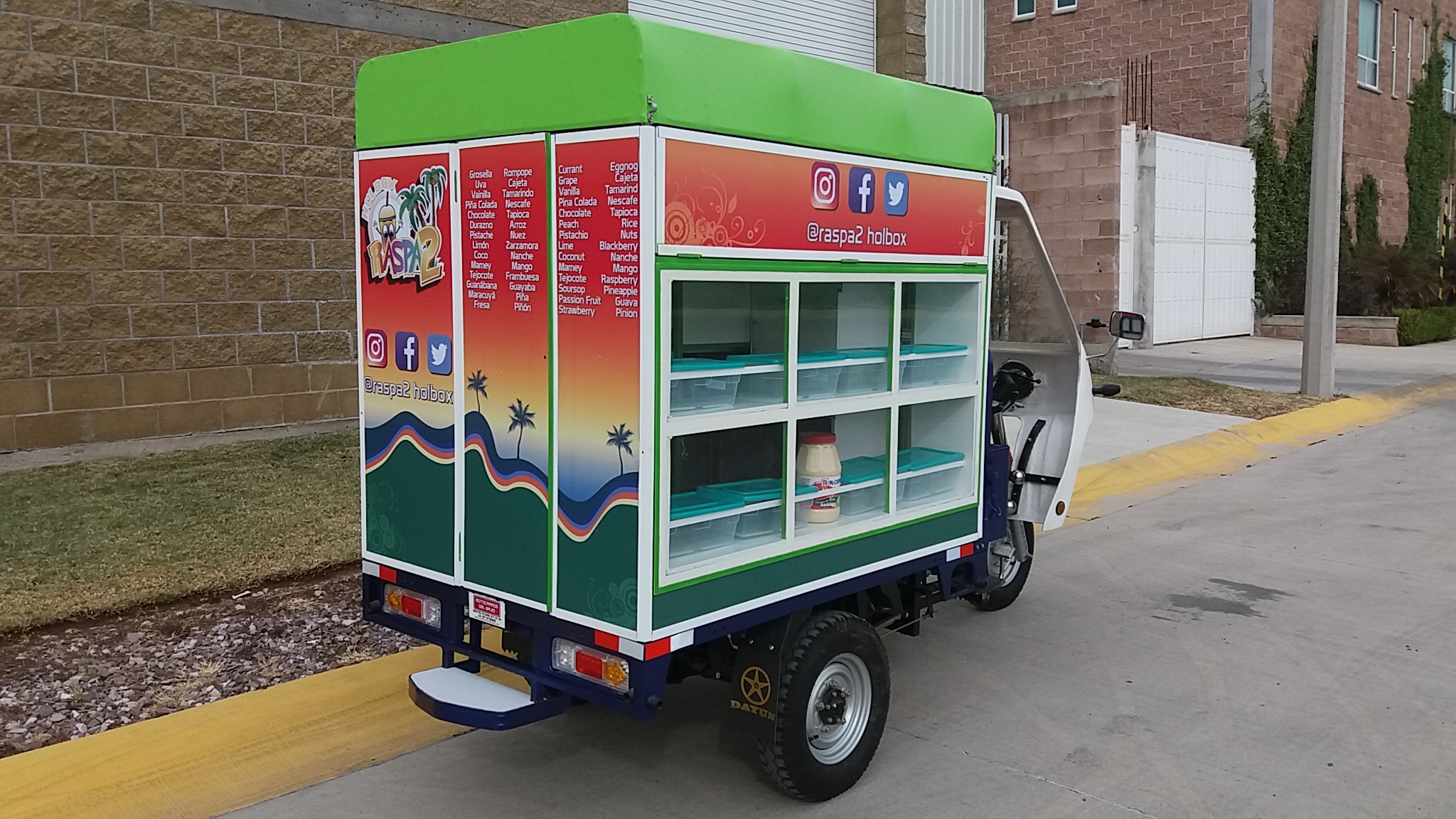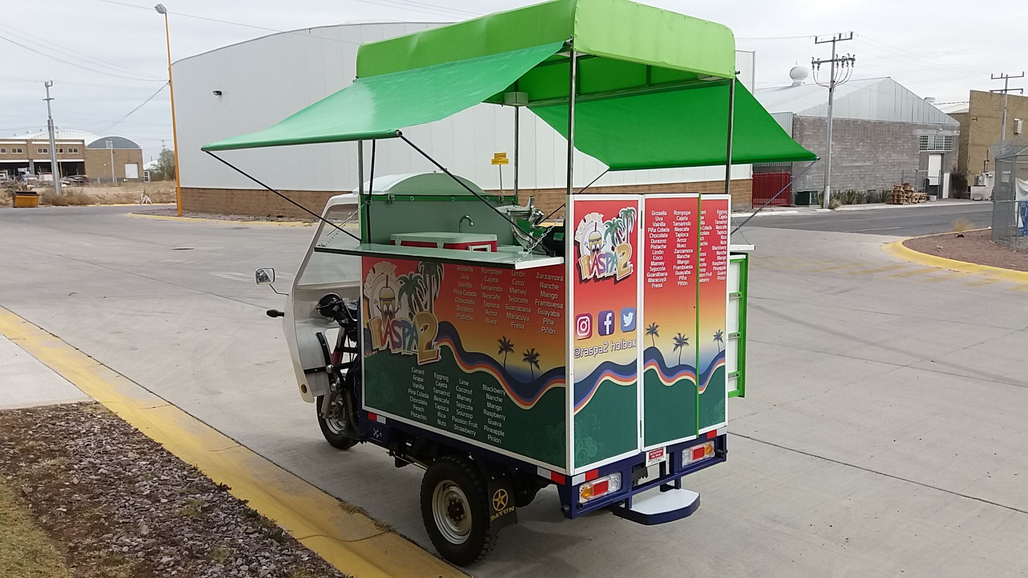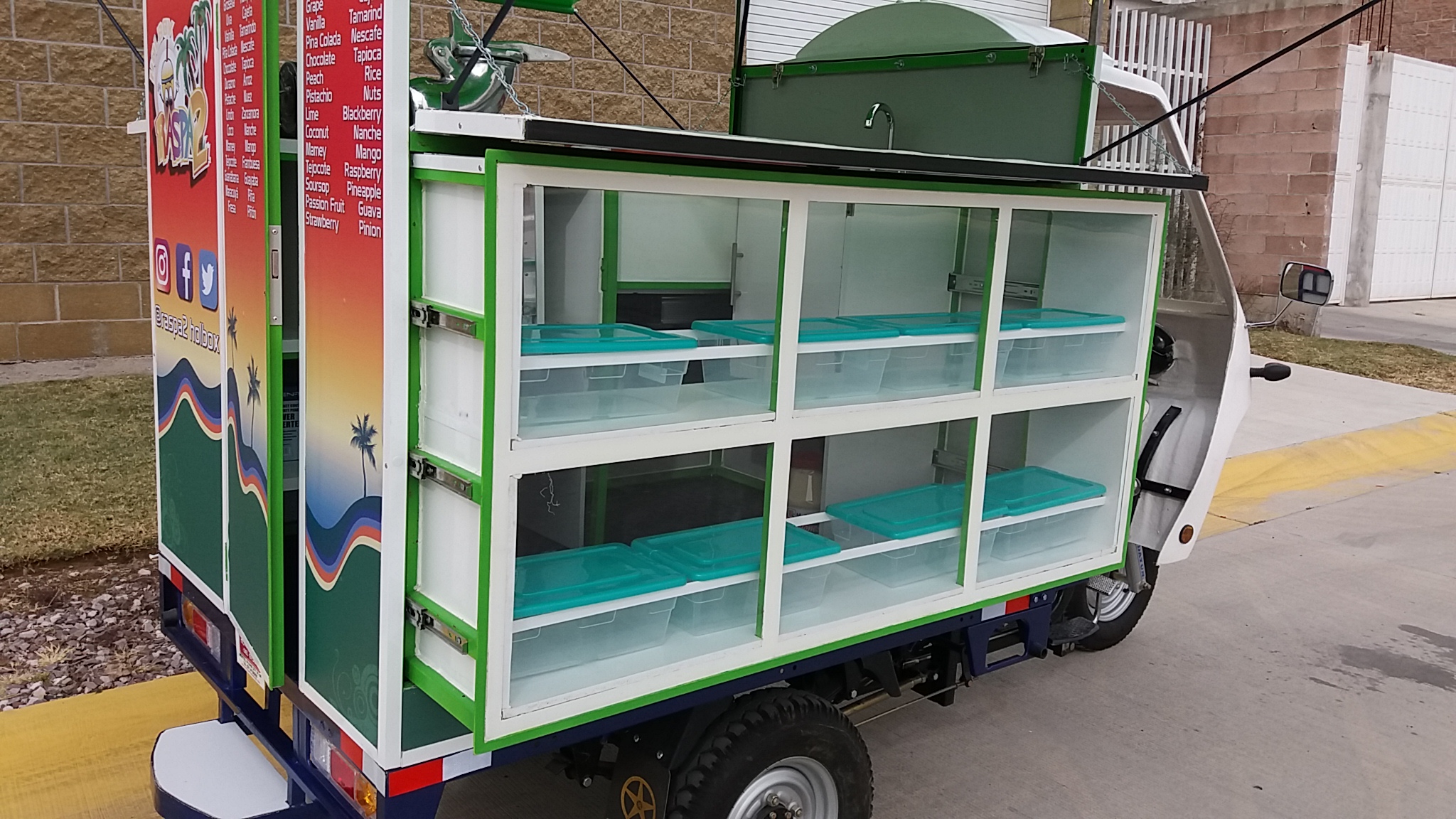 Food Trike con techo desplegable para trabajo desde el interior, vitrina retráctil con frente de acrílico e insertos para jarabe, iluminación, instalación hidráulica con tarja de acero inoxidable, instalación eléctrica con moledora de hielo comercial, hieleras para cubos/bloque de hielo, almacén para consumibles y desechables, barras laterales para entrega de producto y toldos laterales.