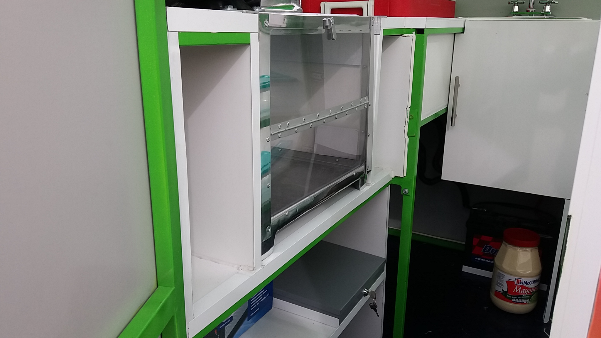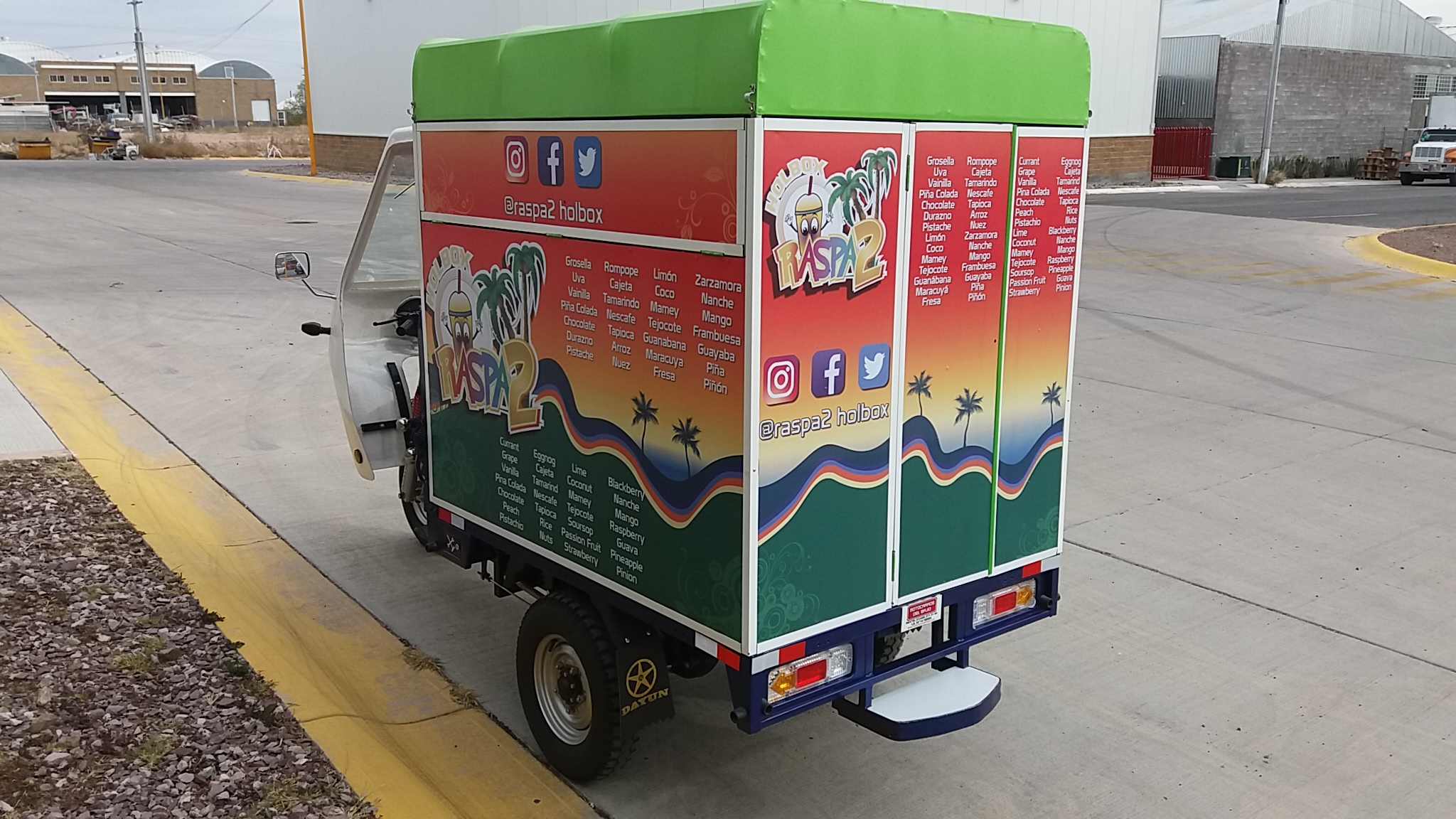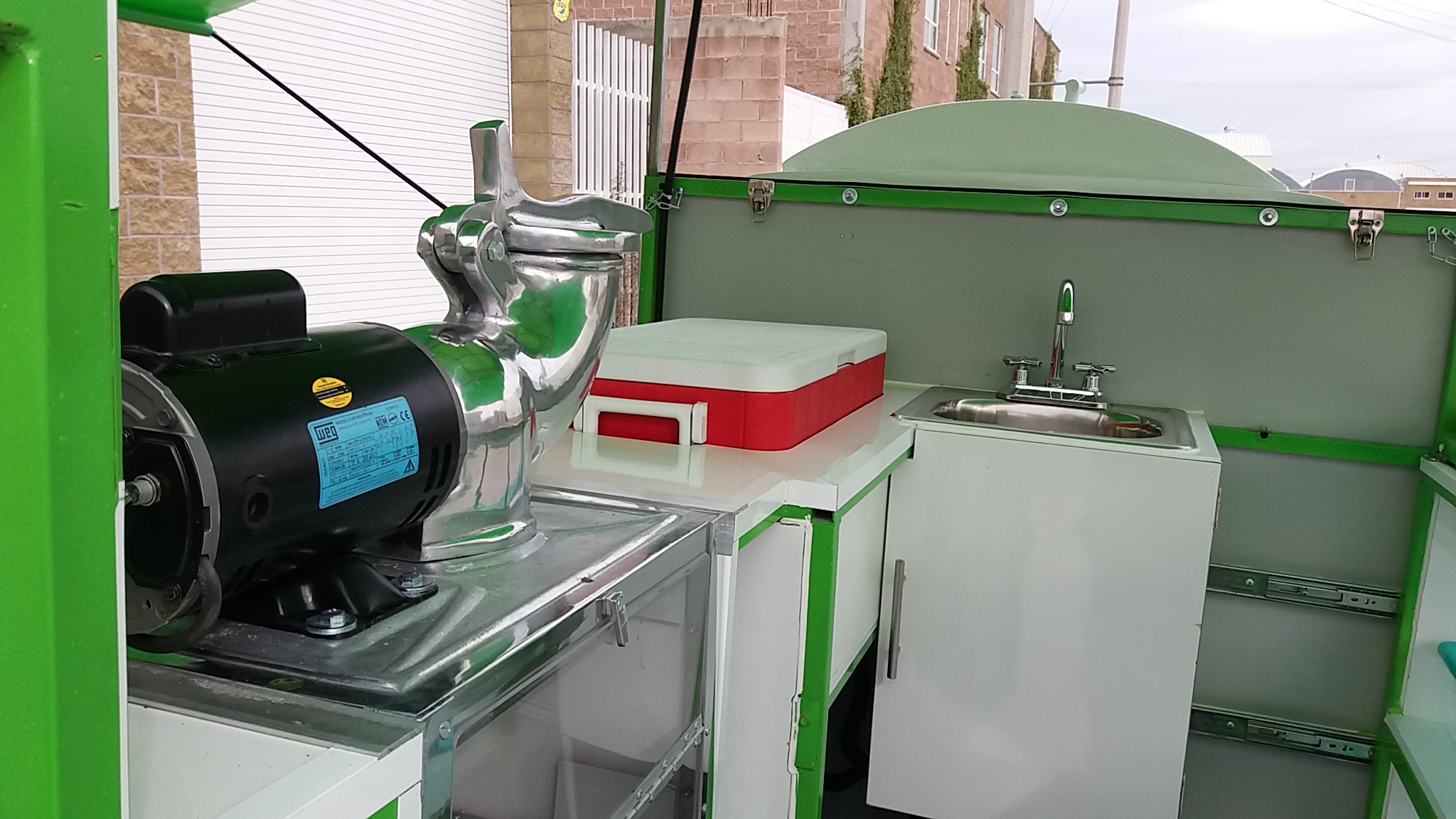 Food Trike con techo desplegable para trabajo desde el interior, vitrina retráctil con frente de acrílico e insertos para jarabe, iluminación, instalación hidráulica con tarja de acero inoxidable, instalación eléctrica con moledora de hielo comercial, hieleras para cubos/bloque de hielo, almacén para consumibles y desechables, barras laterales para entrega de producto y toldos laterales.